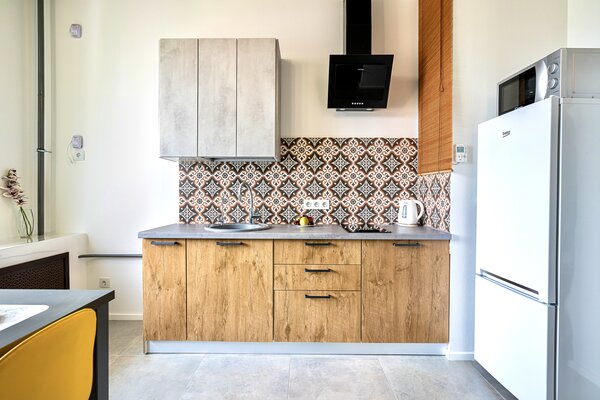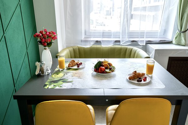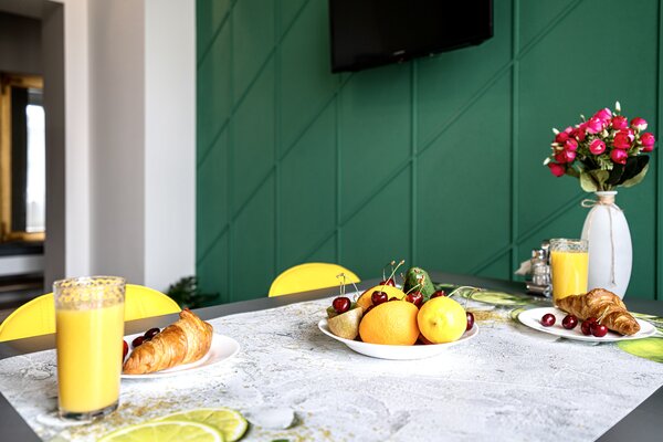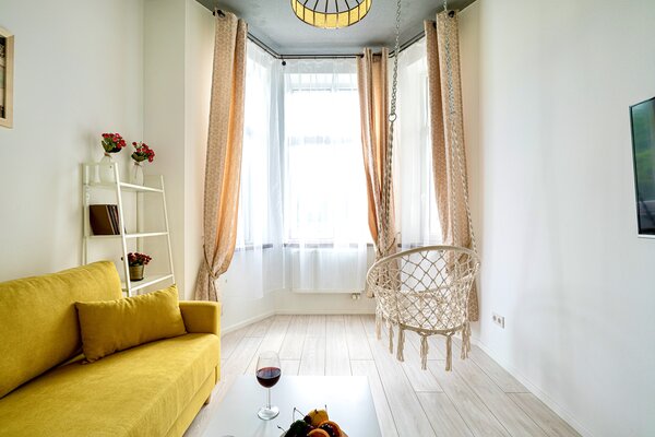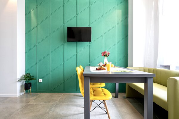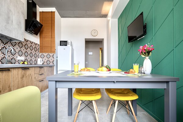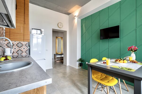 Уютные апартаменты с ярким интерьером предлагают комфортный отдых: удобная кровать, раскладной диван, вместительный шкаф и прикроватные тумбочки. В вашем распоряжении — плоский телевизор с кабельными каналами, кондиционер, высокоскоростной Wi-Fi и стиральная машина. Кухня полностью оборудована (гарнитур, микроволновая печь, холодильник, плита, посуда). Ванная комната оснащена душем, полотенцами и туалетными принадлежностями. Предоставляется парковка.