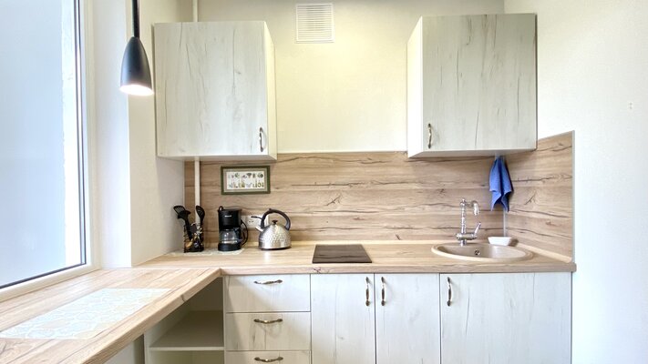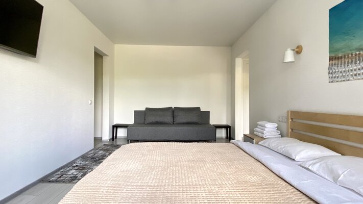 Вас ждет светлая двухкомнатная квартира с мини-кухней, полностью оборудованная всем необходимым: кондиционером, электроплитой, микроволновой печью, холодильником, электрочайником, утюгом и феном. В ванной комнате — полный набор туалетных принадлежностей.