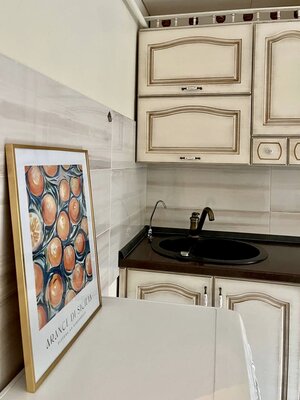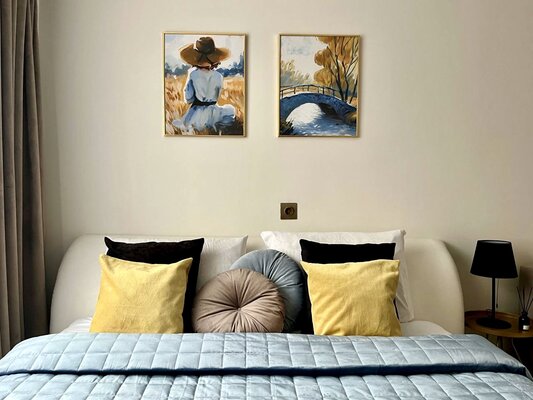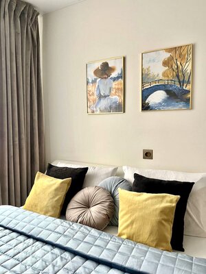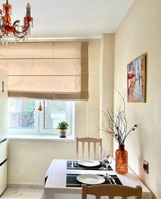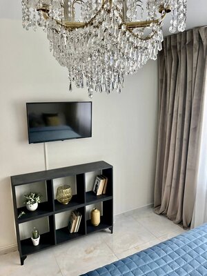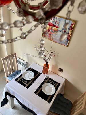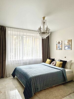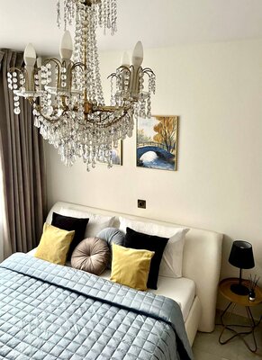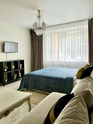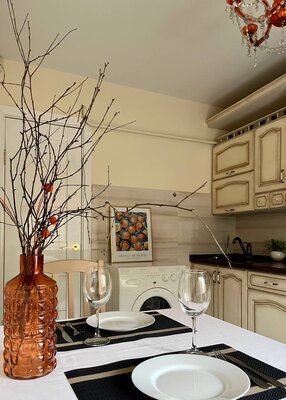 Уютные апартаменты, идеально подходящие как для короткого, так и для длительного отдыха. К вашим услугам комфортабельная двуспальная кровать, удобные диваны, полностью оборудованная кухня (холодильник, микроволновая печь, плита, электрочайник), телевизор, Wi-Fi, а также все необходимое для комфортного проживания: фен, утюг, гладильная доска, посуда, свежие хлопчатобумажные простыни и полотенца, тапочки, туалетные принадлежности (шампунь, гель для душа, мыло), чай, кофе, специи и другие приятные мелочи. В шаговой доступности кофейня и продуктовый магазин. Тихий и спокойный район.
