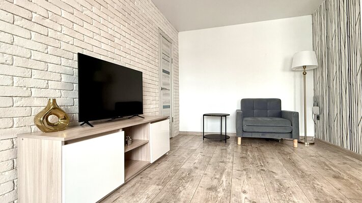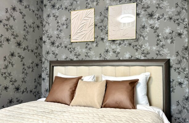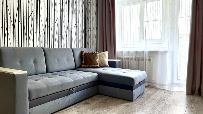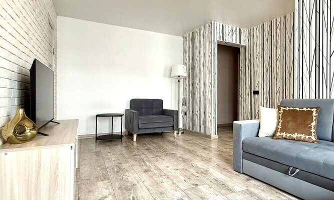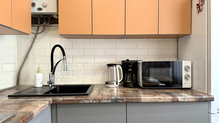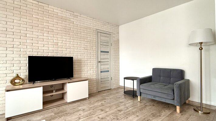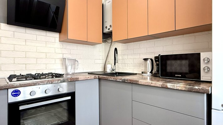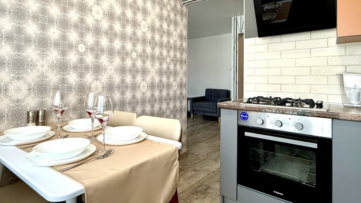 Квартира с уютным светлым интерьером предлагает: двуспальную кровать с ортопедическим матрасом, диван, полностью оборудованную кухню (электроплита, духовка, микроволновка, холодильник, чайник), кондиционер, стиральную машину, ЖК-телевизор, Wi-Fi и санузел с душем.