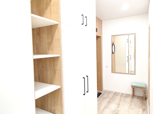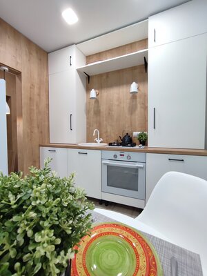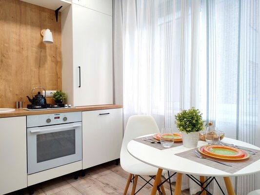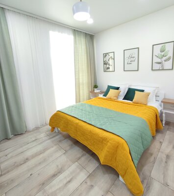 Светлые и уютные апартаменты современного дизайна и новым ремонтом. В апартаментах имеется большая двуспальная кровать для комфортного отдыха, ТВ в комнате, полностью оборудованная кухня для приготовления пищи с необходимой посудой, а также ванная комната с душевой кабиной.