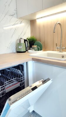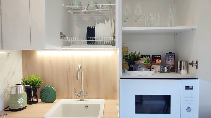 Внутри апартаментов гости найдут современную мебель и технику, включая одну большую двуспальную кровать и раскладной диван размером 160х200 см. В наличии также стиральная машина, микроволновая печь, посудомоечная машина, быстрый Wi-Fi, 2 телевизора, гладильная доска, утюг, сушилка. Отдельно оборудованная кухня с полным набором посуды, системой фильтрации воды, газовой плитой, стаканами и бокалами.