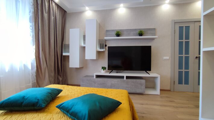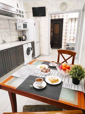 В апартаментах вас ждет современный ремонт, 2 спальные кровати, удобный диван для отдыха, полностью оборудованная кухня с плитой, холодильником, микроволновой печью и духовкой, а также ванная комната с душевой кабиной. Для вашего удобства в апартаментах также есть гладильная доска и утюг.