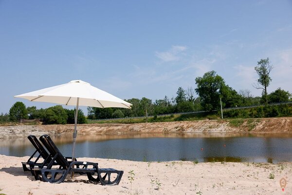 Чистое озеро, мягкий и золотистый песок и удобные шезлонги!