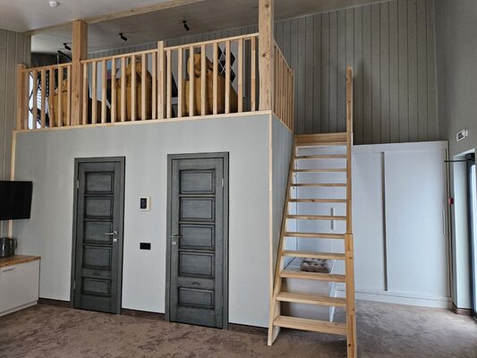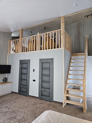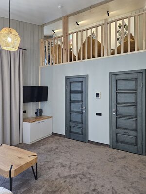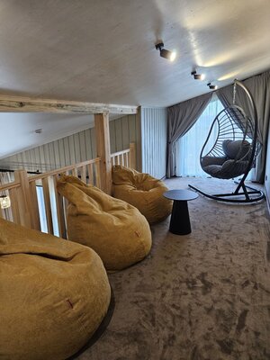 Зона отдыха, оборудованная мягкой мебелью, камином и библиотекой, создает идеальные условия для полного расслабления. Виниловый проигрыватель и пианино придают этому уголку уникальный шарм, позволяя наслаждаться приятной музыкой и забыть о повседневной суете.