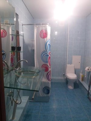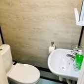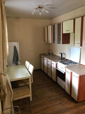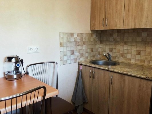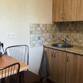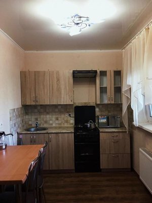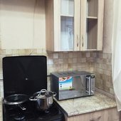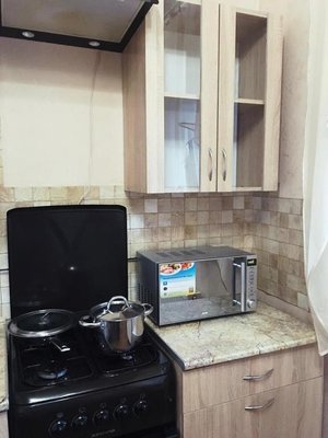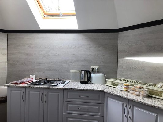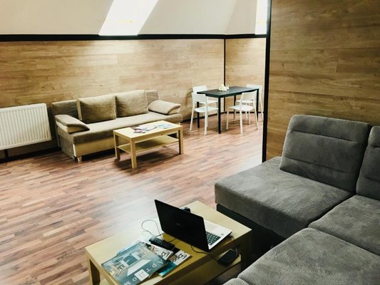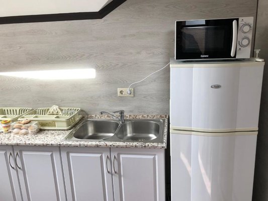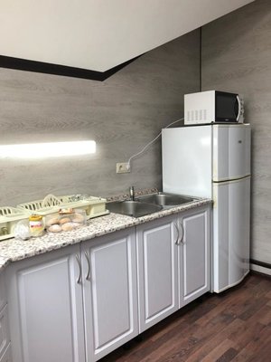 Приготовление еды возможно в общем помещении. Есть все необходимое: холодильник, рабочая и варочная поверхность, обеденный стол, стулья.