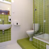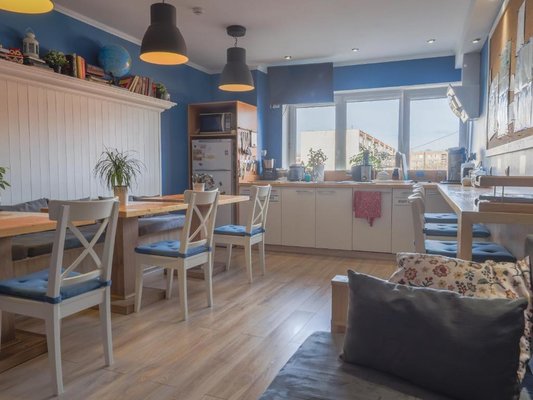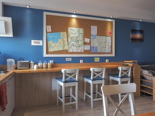 Общая кухня укомплектована плитой, микроволновой печью и холодильником. Установлены посудомоечная и стиральная машины. Имеется общий лаундж с телевизором.