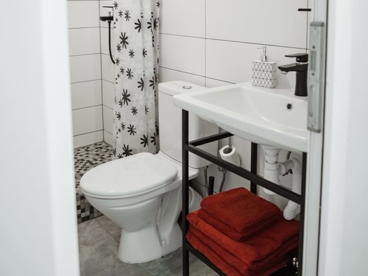 Индивидуальные ванные комнаты расположены отдельно на территории и оснащены всем необходимым. Халаты и фен входят в стоимость проживания..