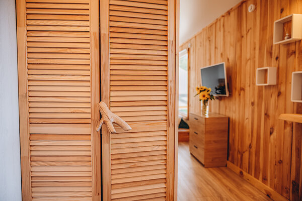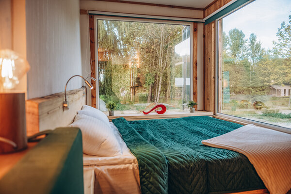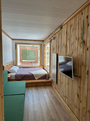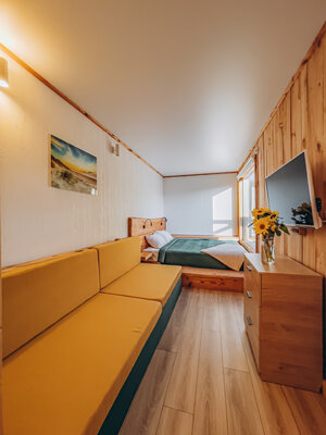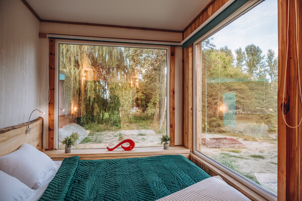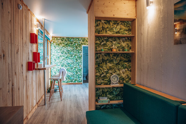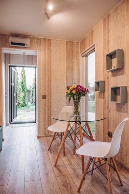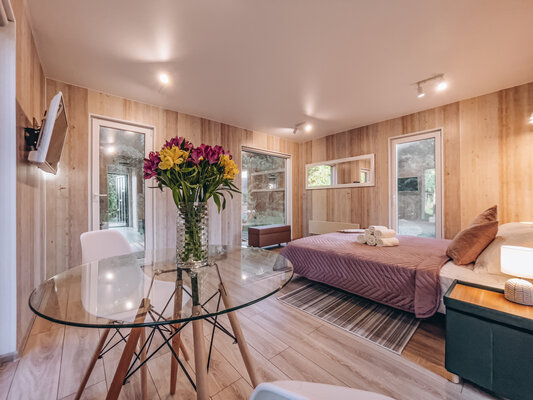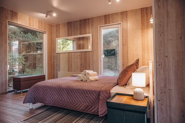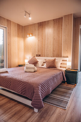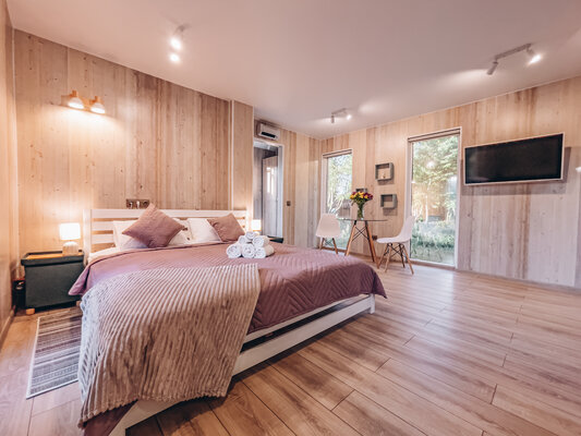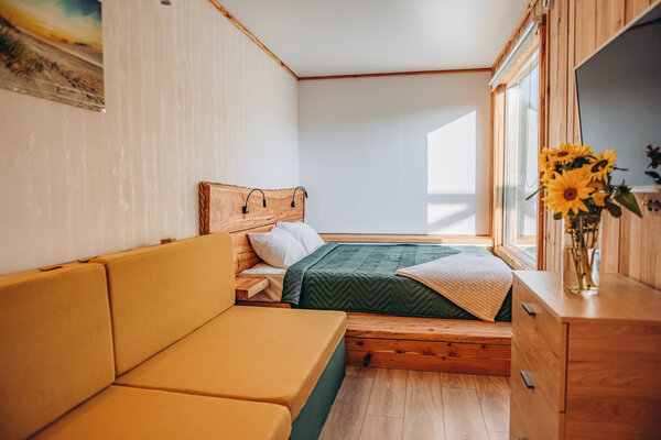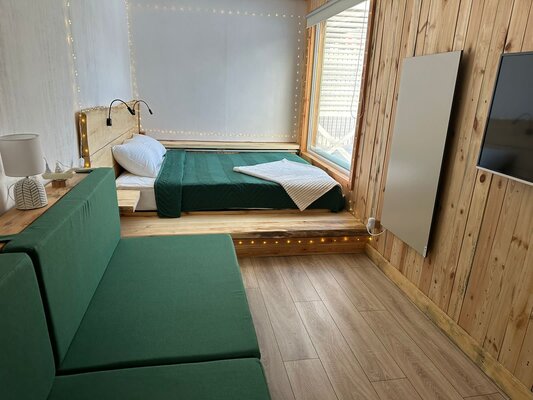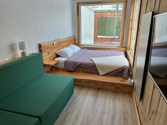 Деревянные домики рассчитаны на комфортное размещение до двух взрослых гостей и одного ребенка до 14 лет, с возможностью добавления дополнительного места на диване.