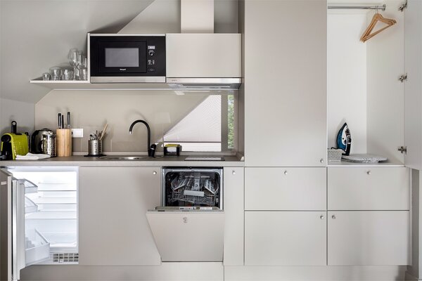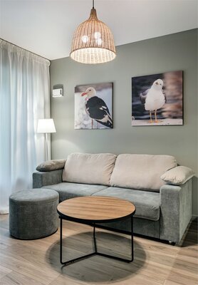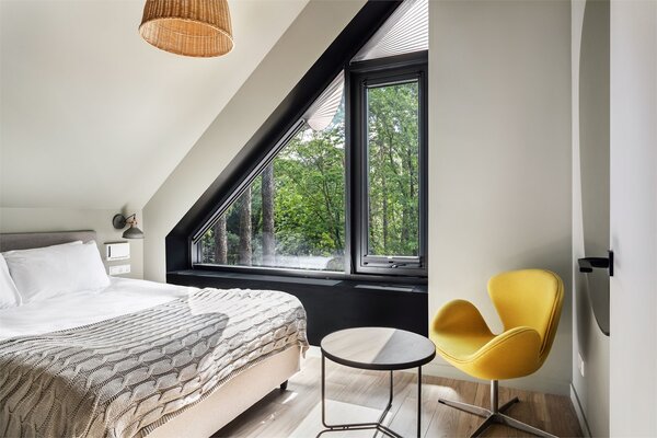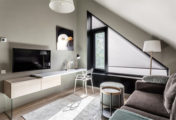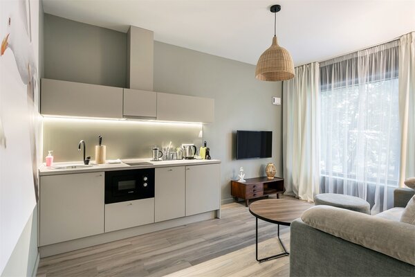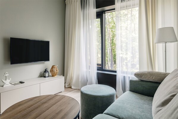 Апартаменты имеют просторную террасу с видом на лес, общую с соседними номерами.