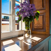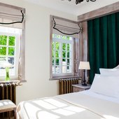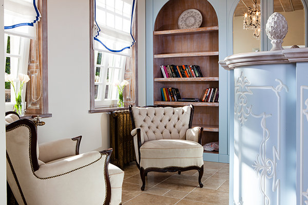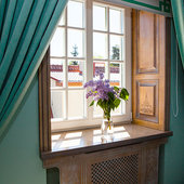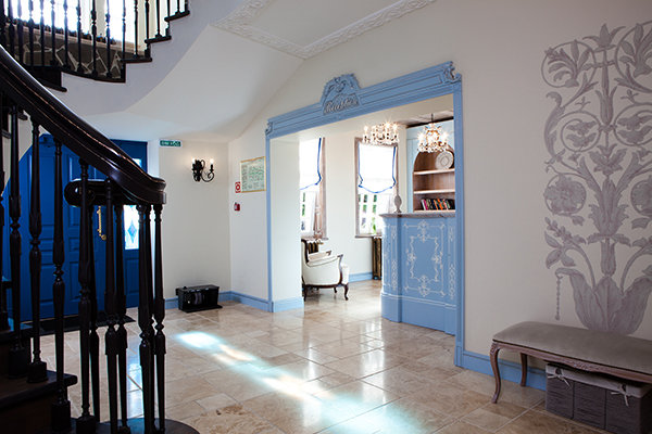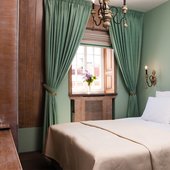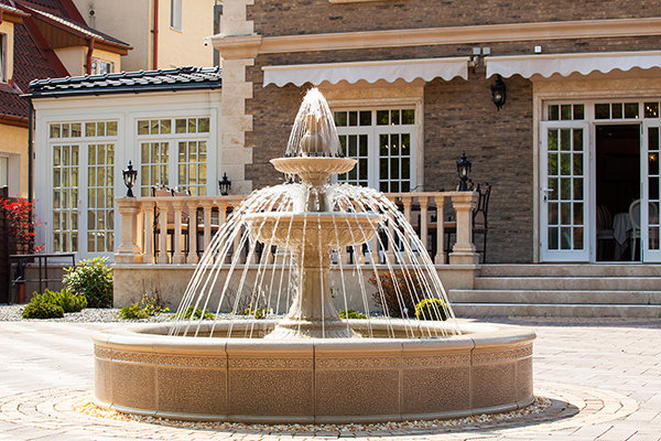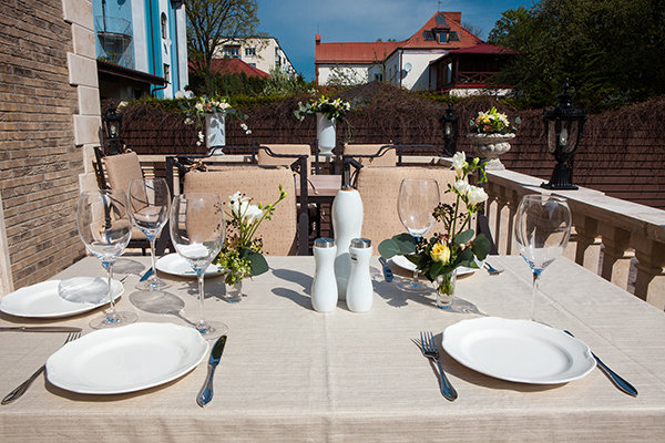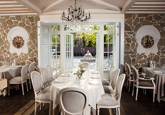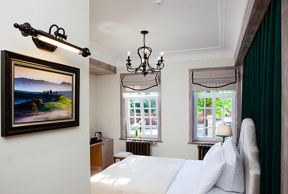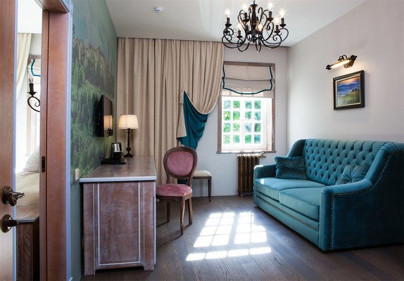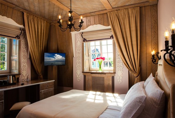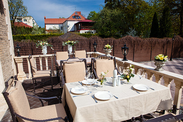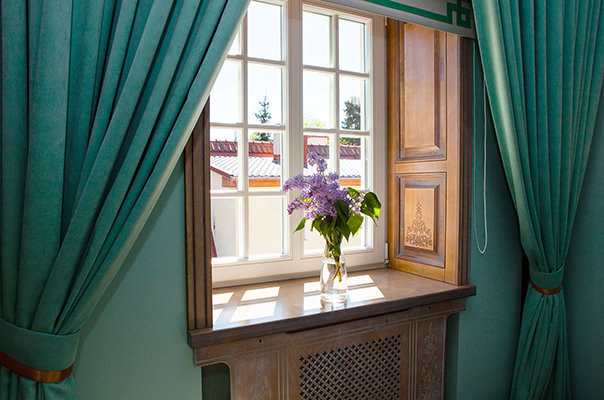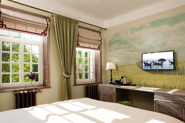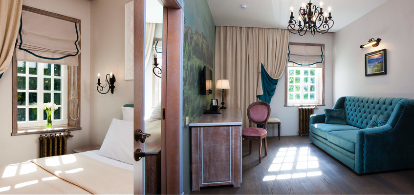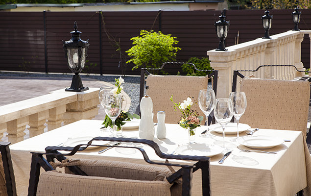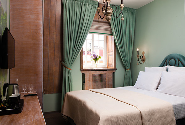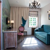 Своей запоминающейся входной дверью цвета лазурного моря отель выходит на тихую улицу имени Пушкина, а ресторан отеля заканчивается террасой с видом на центральный парк города, деревья которого как зеленой стеной закрывают этот уголок тишины и душевного спокойствия.