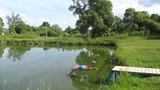 В пруду два вида рыбы — карась и карп среднего веса 700гр. Ловим на поплавочную удочку по два 700граммовых карпа на гостя.