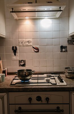 Гостям предлагается полностью укомплектованная кухня с газовой плитой, чайником, микроволновой печью, посудомоечной машиной и полным набором посуды. Просторная гостиная оснащена удобным диваном и креслом для релаксации, а также телевизором.