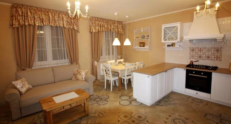 На первом этаже расположена совмещённая с трапезной и полностью оборудованная кухня. По желанию можно приготовить еду самостоятельно.