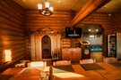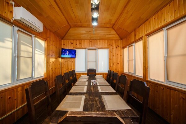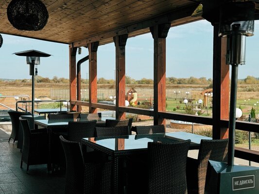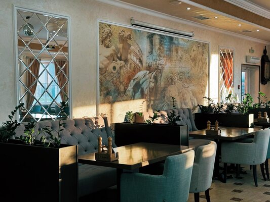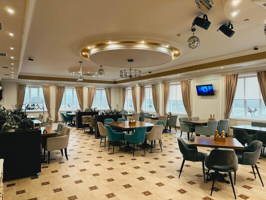 На первом этаже находится ресторан, рассчитанный на 130 человек, предлагающий блюда русской, кавказской и европейской кухни. В теплое время года работает летнее кафе.