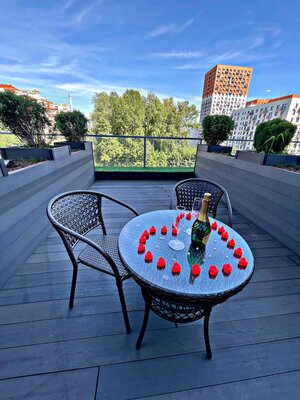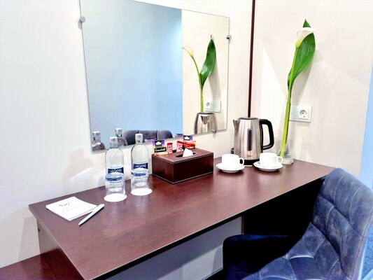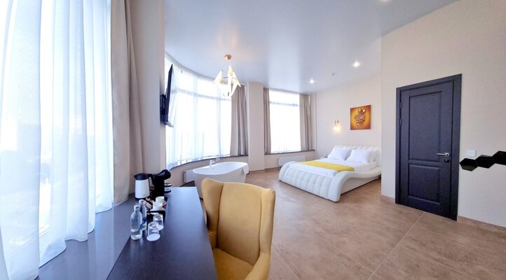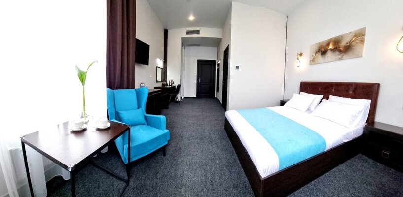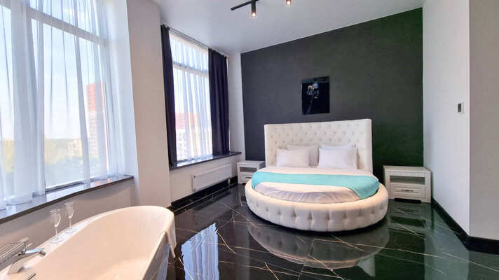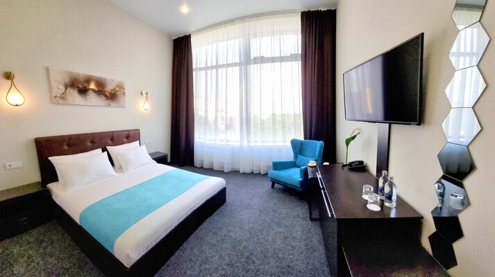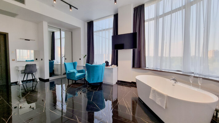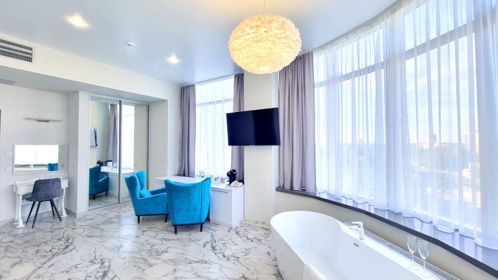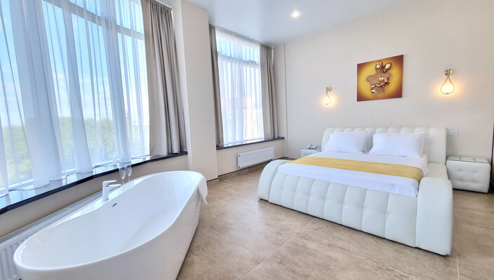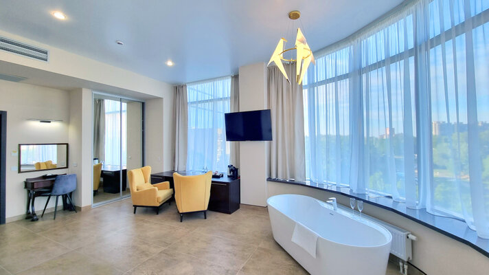 К вашим услугам широкий выбор номеров — от уютных стандартных до просторных двухкомнатных семейных люксов (28-70 кв.м). Все они впечатляют высокими потолками и панорамными окнами, открывающими великолепные виды на город или живописный парк.