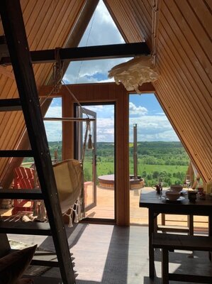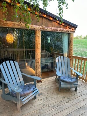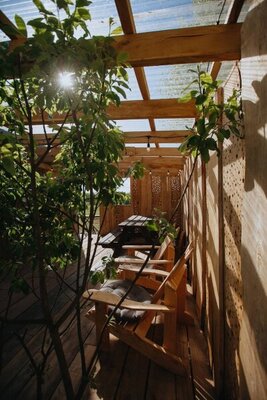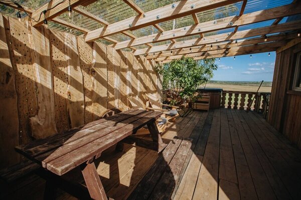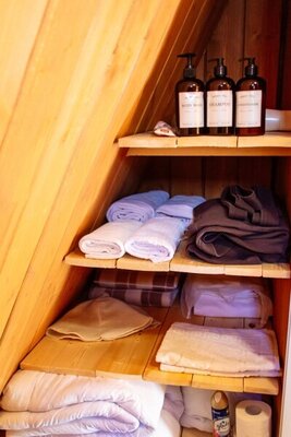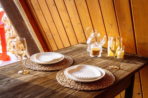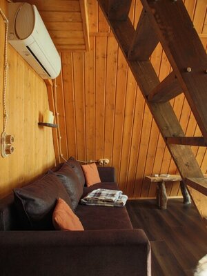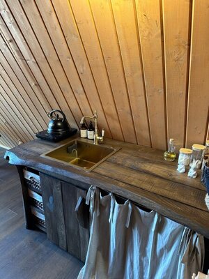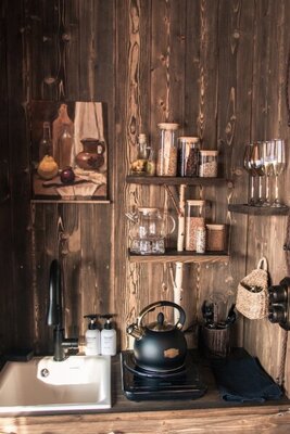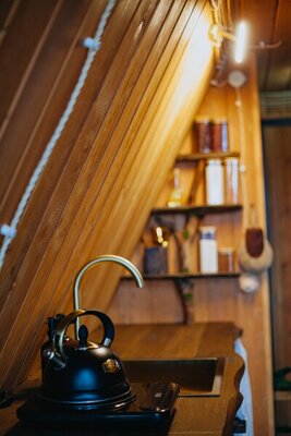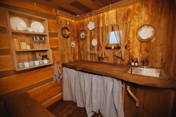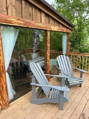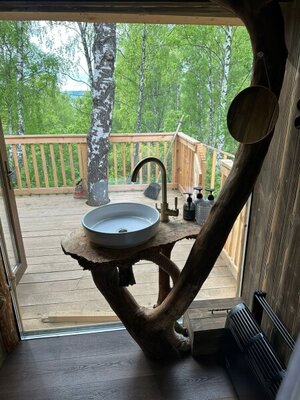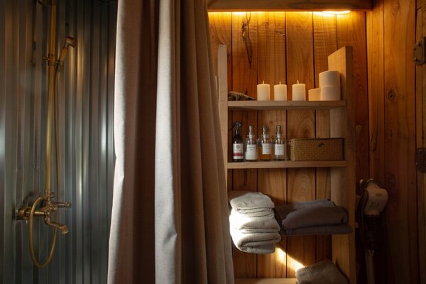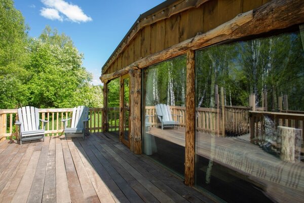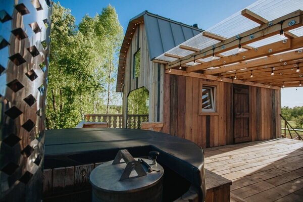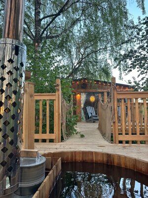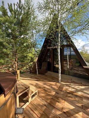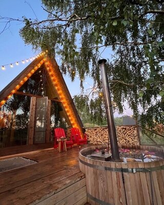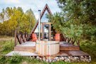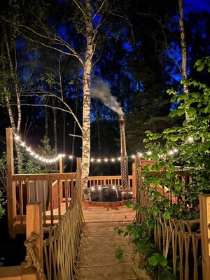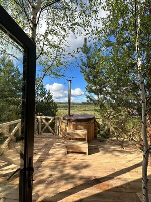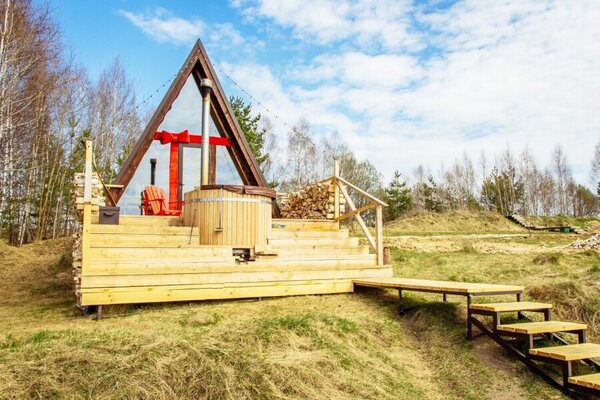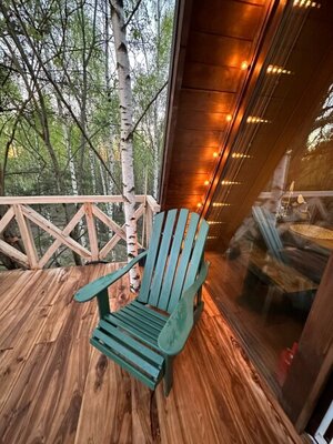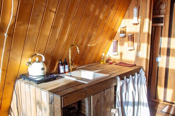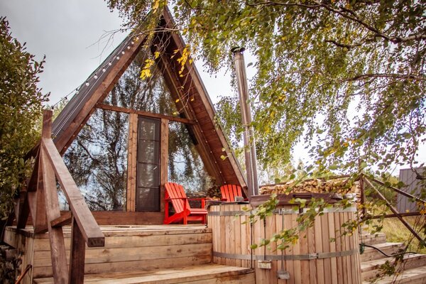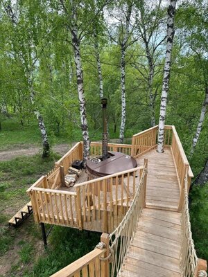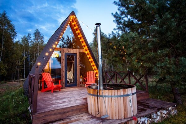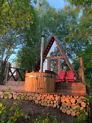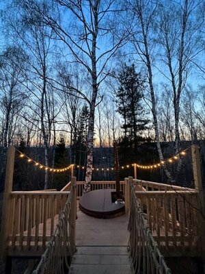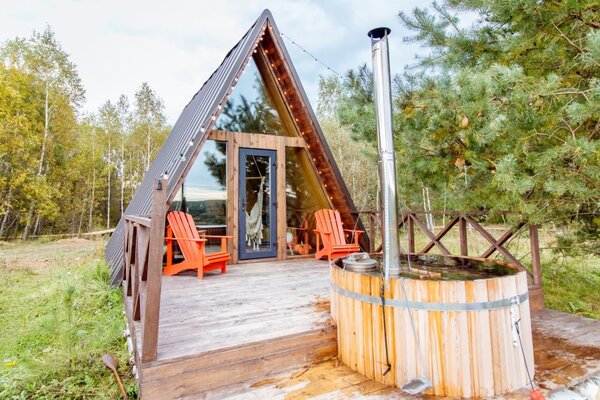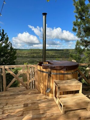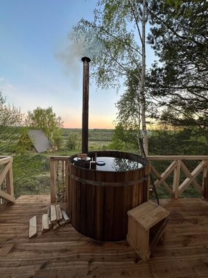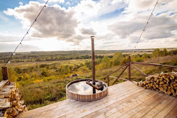 Изюминка глэмпинга — видовые горячие купели «Фурако» из лиственницы, расположенные на террасе каждого шале! Купель растапливается к Вашему приезду, время купания не ограничено — оставляются дополнительные дрова.