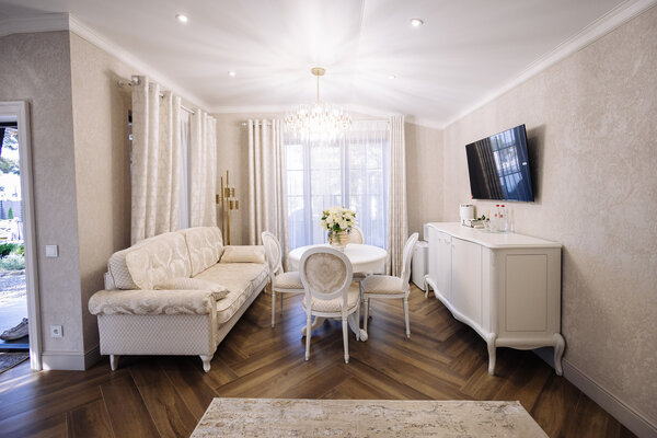 К услугам гостей — комфортабельные и уютные коттеджи, оснащенные современным ремонтом, элегантной мебелью и всей необходимой техникой. Для удобства предусмотрены туалетно-косметические принадлежности, фен, полотенца, халаты и тапочки.