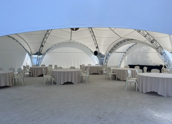 - Вместимость: Шатёр способен с комфортом разместить до 200 гостей в формате банкета и до 340 человек в формате фуршета, что делает его идеальным решением для проведения масштабных мероприятий.