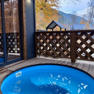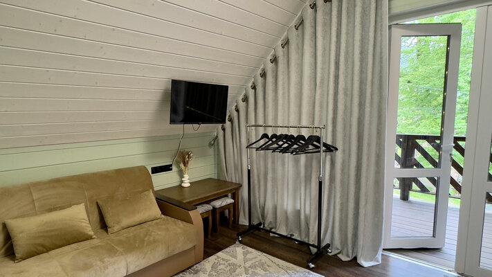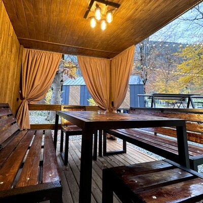 На территории есть зоны для барбекю, беседка, детская площадка, батут и горный ручей. За дополнительную плату предлагаются баня с купелью, экскурсии, джиппинг и конные прогулки.