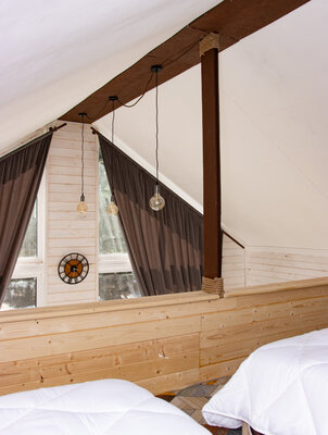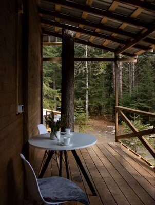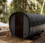 Банный комплекс включает в себя банный чан и бaню-бoчку с предбанником из которого открывается вид на хвойный лес.