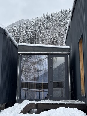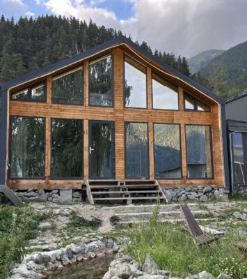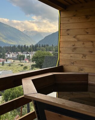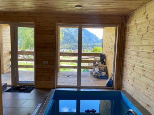 Русская баня на дровах с купелью — идеальное место, чтобы расслабиться и насладиться прекрасными видами на горы со второго этажа, где расположена зона отдыха.