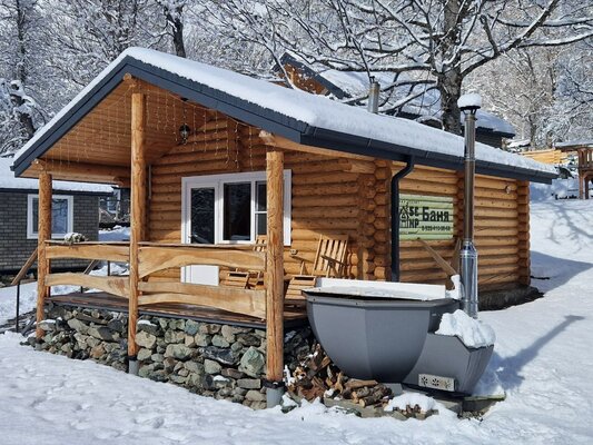 База отдыха «Горный приют Base Camp» предлагает уютную русскую баню-сруб, способную разместить до шести человек. Здесь имеется зона отдыха, душ и туалет, а веранда открывает живописный вид на лес.