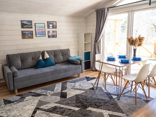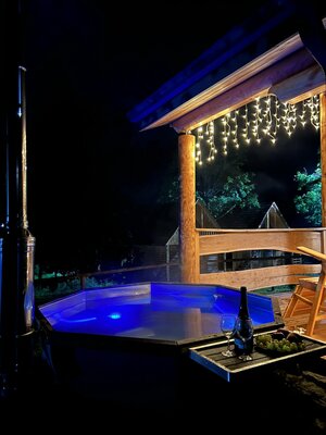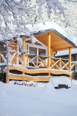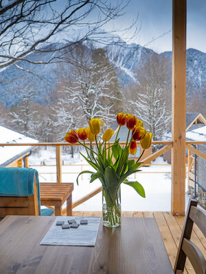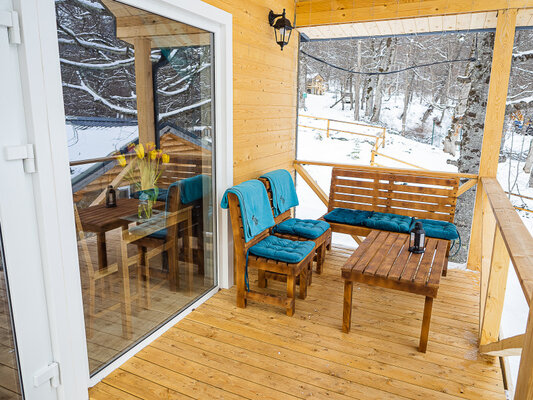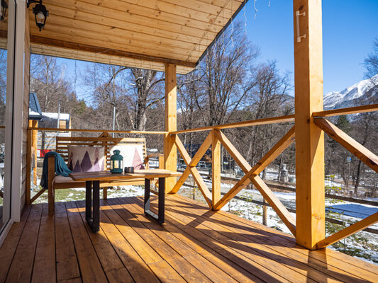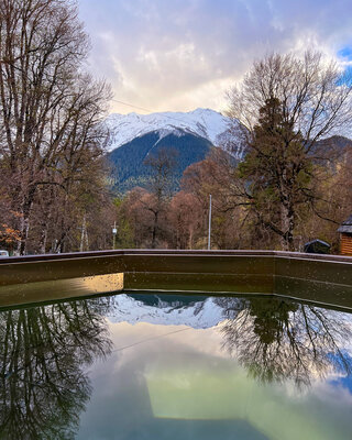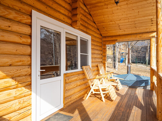Гости могут полностью расслабиться, наслаждаясь горячими процедурами в чане, который отапливается дровами. Из него открывается великолепный вид на горы. Кроме того, этот чан можно использовать как холодную купель, создавая уникальное сочетание контрастных температур для отдыха.