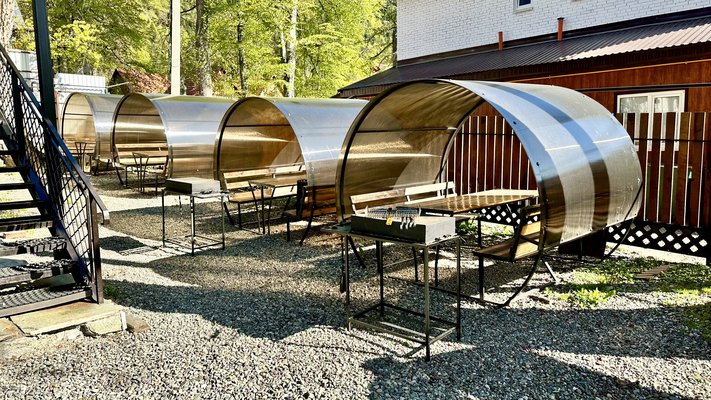 Также есть зона барбекю с мангалами и открытыми беседками. Гости могут насладиться изысканными деликатесами «с дымком» абсолютно бесплатно.