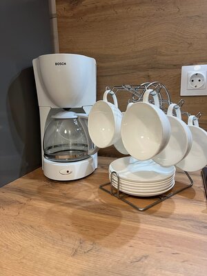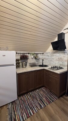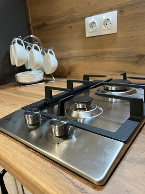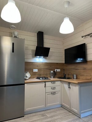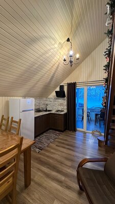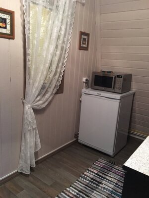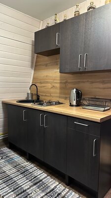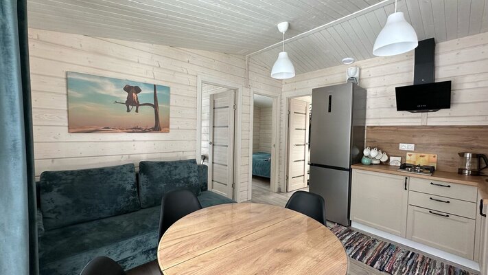 В каждом домике имеется полностью оборудованная кухня с газовой плитой, холодильником, микроволновой печью, посудой и чайником для приготовления домашних блюд.