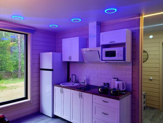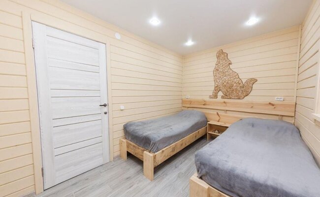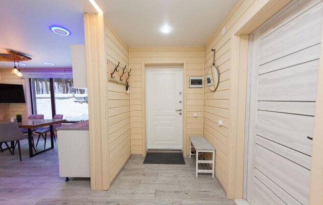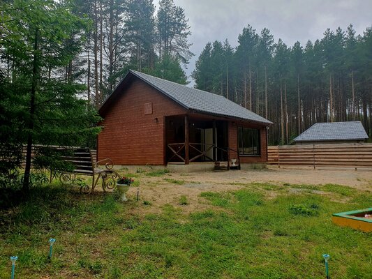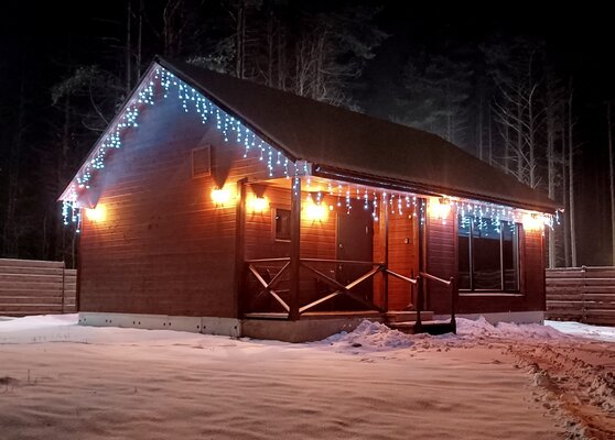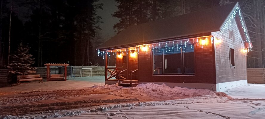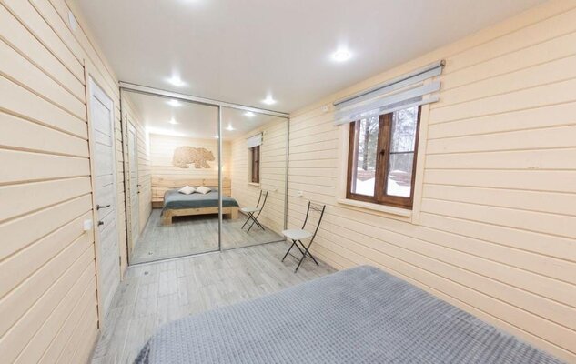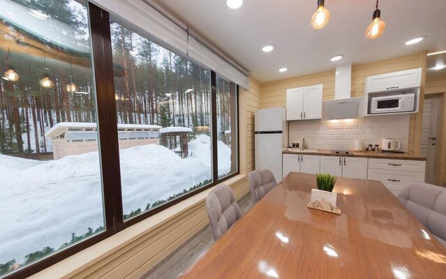 Дом полностью оборудован современной техникой и теплыми полами. Он располагает уютными спальнями, душевой со всеми необходимыми принадлежностями и просторной гостиной с панорамными окнами, из которых открывается живописный вид на сосновый лес.