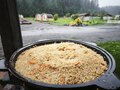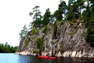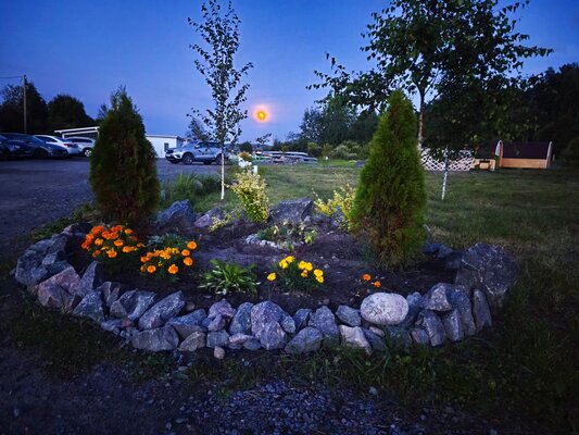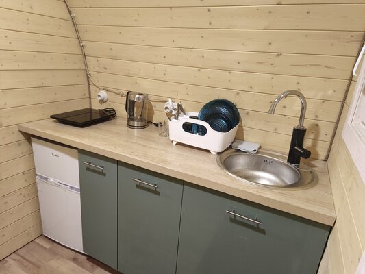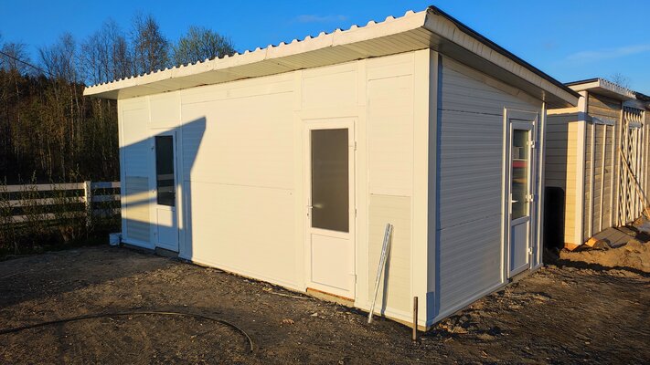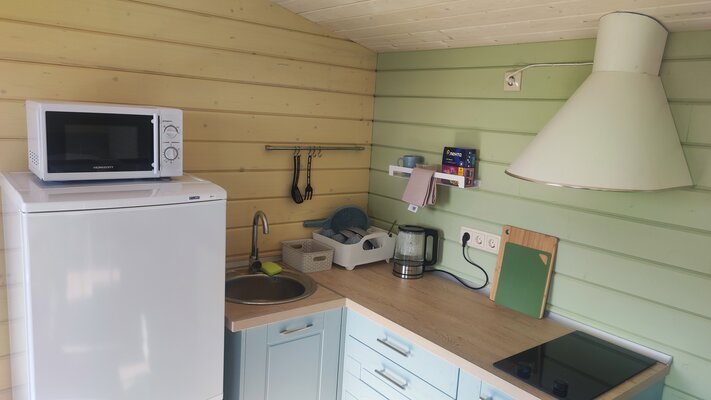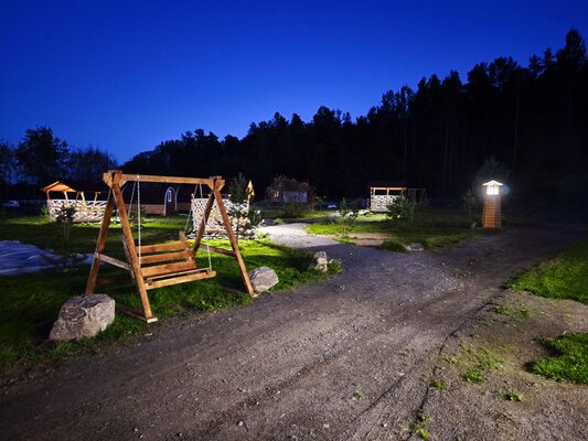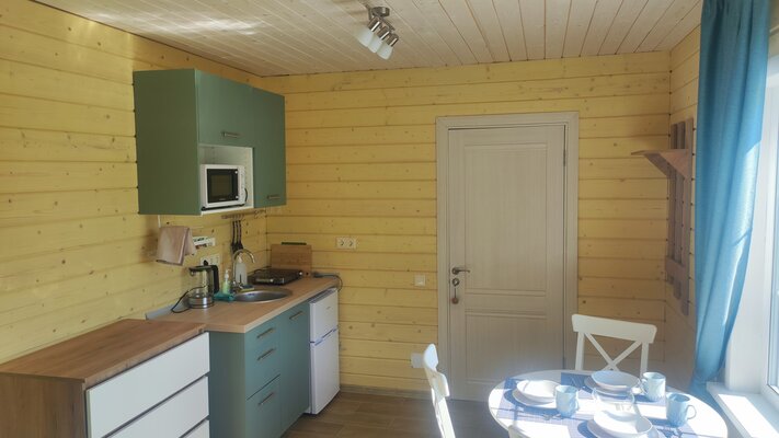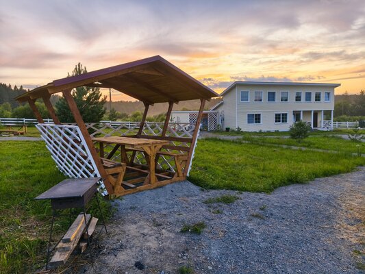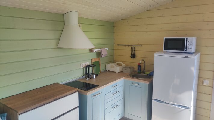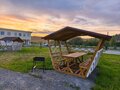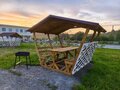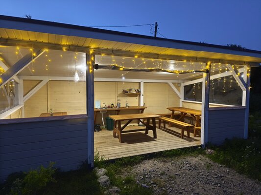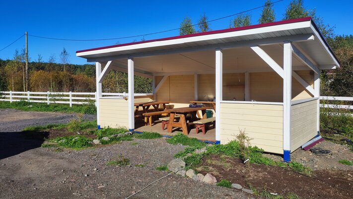 К услугам гостей возможность удобно разместиться для приготовления шашлыка или плова в гриль-домике с открытой террасой. На террасе дополнительно установлен стол и две лавки, чтобы можно было посидеть в хорошую погоду на открытом воздухе. Гриль-домик установлен в верхней точке участка, поэтому с террасы открывается красивый вид на территорию и ладожские шхеры.