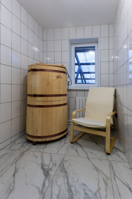 На первом этаже комплекса — баня, а также купель на открытом воздухе. На втором — соляная комната и две кедровые бочки, а также косметологические кабинеты – массажа и водорослевых обертываний ламинарией.