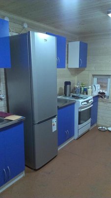 Кухня гостевого дома обустроена бытовой техникой и достаточным количеством посуды.