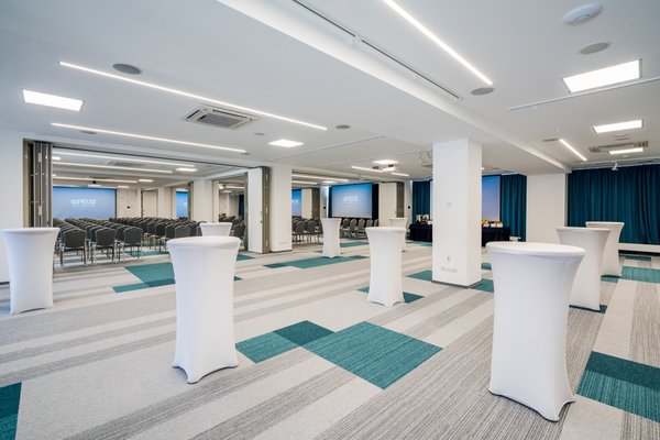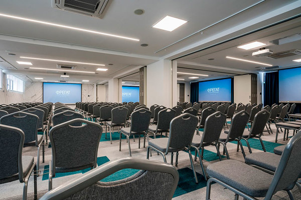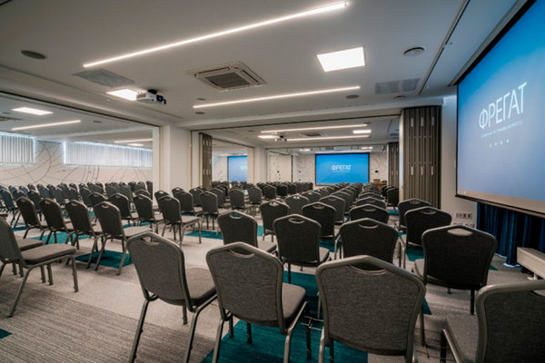 Отель располагает несколькими залами разной вместительности. Каждый зал с панорамными окнами на парк имеет искусственное затемнение с помощью штор blackout. Площадь зала позволяет разместить от 250 до 400 человек. В зале имеется: