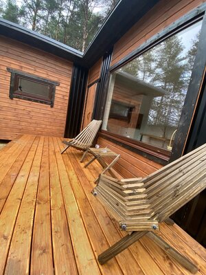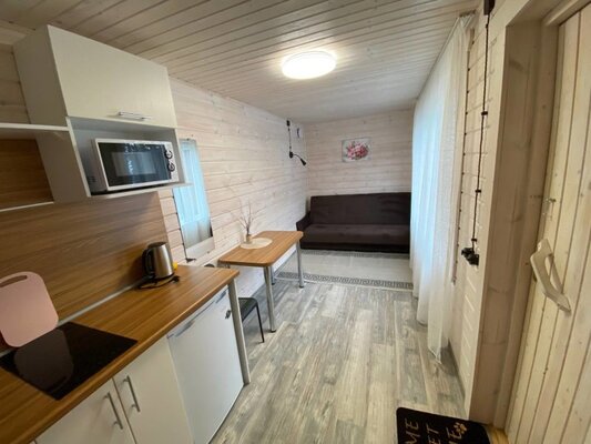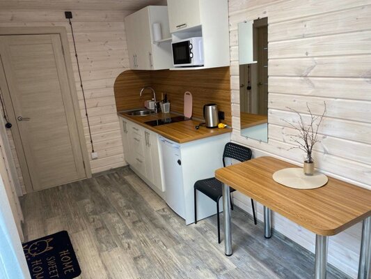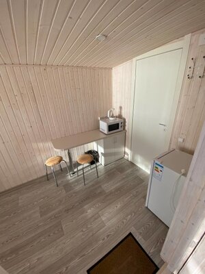 Малая баня рассчитана на 4-5 человек. Большая вместительная парная совмещенная с помывочной, раздевалка со столом для чаепитий. Терраса, с которой открывается прекрасный вид на озеро, вечерние закаты солнца и ночное звездное небо. К бане прилагаются банные простыни, свежий дубовый веник, шапочки и перчатки
