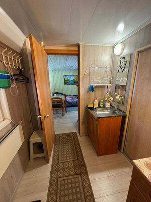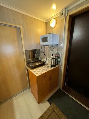 Домик оснащен всем необходимым для комфортного пребывания: кухней-гостиной, спальней и современным санузлом с душевой кабиной. В кухне предусмотрена вся техника и посуда для самостоятельного приготовления пищи — микроволновая печь, холодильник, электроплита и чайник.