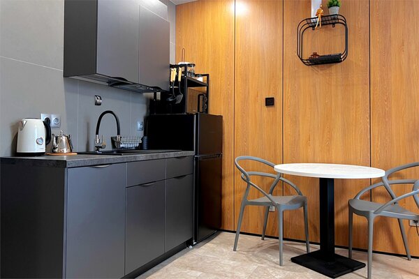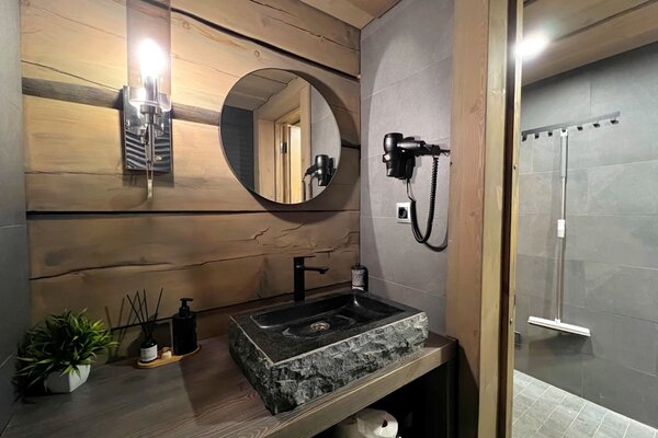 Баня вмещает до 6 гостей. Есть обливная система, душ, зона отдыха, кухня, санузел.