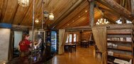 Интерьер заведения выполнен в стиле карельской избы, а природные материалы и традиционная заонежская вышивка в интерьере создают атмосферу уюта и комфорта.