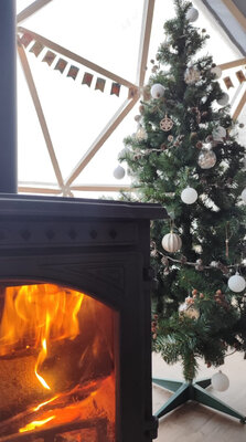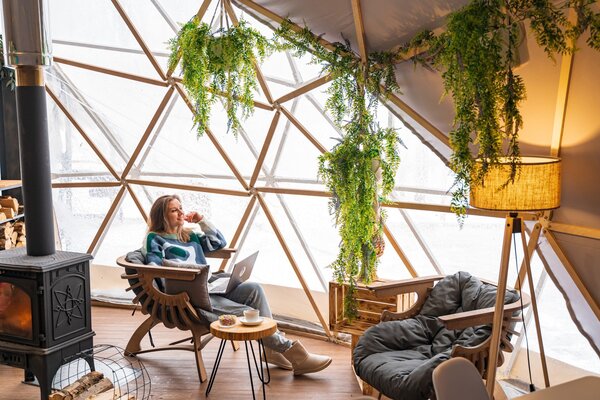На территории эко-отеля есть уютное кафе-шатер, где можно пообщаться с другими гостями, согреться у камина и насладиться горячим кофе. За столы легко вмещается 30 человек.