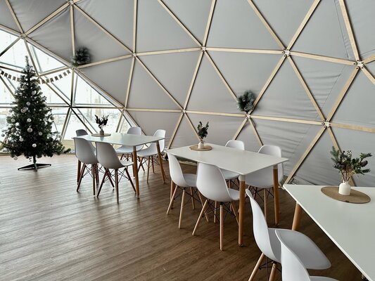 Шатер для мероприятий вместимостью до 30 человек. Оснащен теплым полом, камином, барной стойкой и большим телевизором. Есть необходимая мебель — стулья и столы. Условия аренды и технические детали обсуждаются индивидуально. Минимальный срок аренды — 3 часа.
