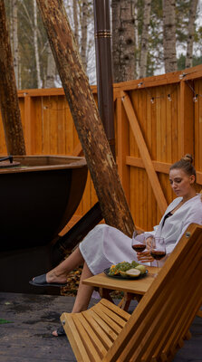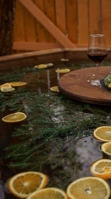 Для посетителей доступны два подогреваемых банных чана, расположенных на берегу озера. Эта уникальная конструкция объединяет в себе функции полноценной бани и купельного чана, в центре которого расположен удобный столик. В этих чанах Вы сможете насладиться купанием в любое время года, а присутствие хвойных и цитрусовых добавок не только наполнит воду ароматом, но и укрепит Ваш иммунитет.