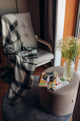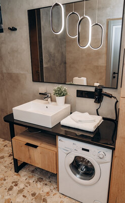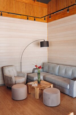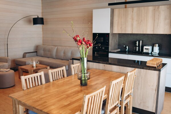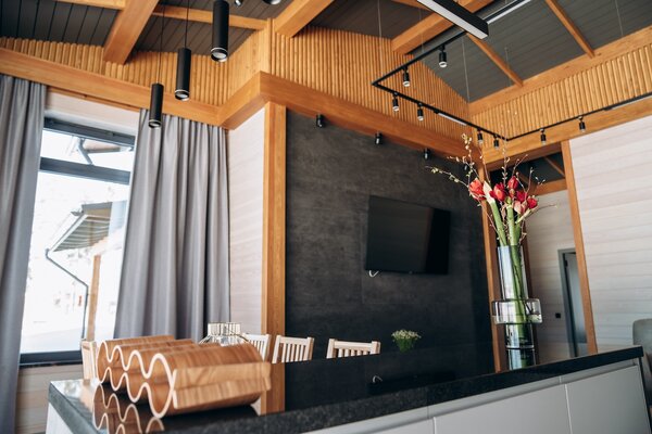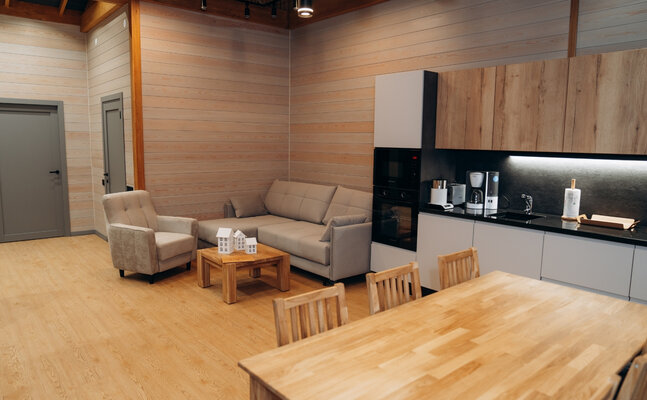 Для проживания гостей подготовлены уютные дома, в которых обеспечено все необходимое для комфортного отдыха. Дома построены с применением дизайнерского проекта из экологически чистых материалов. В каждом доме имеется удобная кровать с ортопедическим матрасом, свежее постельное белье, собственная ванная комната с стиральной машиной и подключение Wi-Fi.