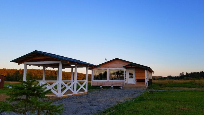 Беседка с камином, необходимой мебелью и набором посуды возле большого бревенчатого дома на берегу.