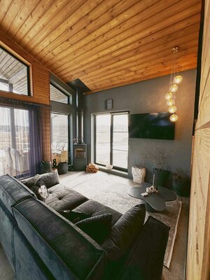 К услугам гостей два уютных спальных номера с двуспальными кроватями, полностью оборудованная кухня и комфортная гостиная с диваном. Насладитесь свежим воздухом и потрясающими видами с просторной террасы. Дом оснащен всем необходимым для комфортного проживания, включая смарт-ТВ в каждой комнате и современную бытовую технику.