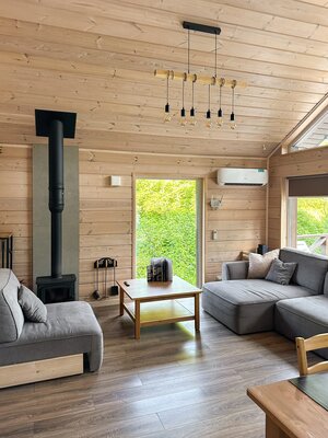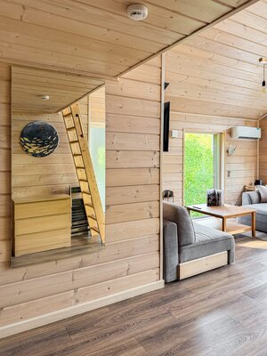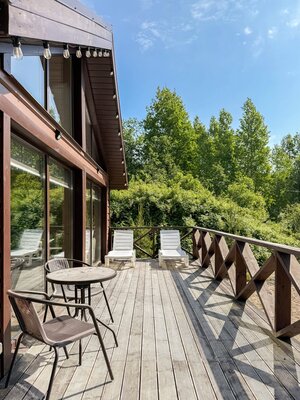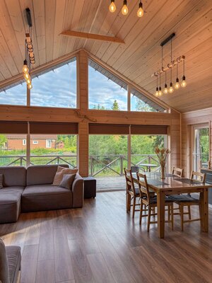 Внутри вас ждет современное оснащение: полностью укомплектованная кухня (посудомоечная машина, микроволновая печь), стиральная машина, электрическая сауна, телевизор и атмосферный дровяной камин. Высокоскоростной Wi-Fi, кондиционер и теплые полы обеспечат идеальный микроклимат в любое время года. Отдых на свежем воздухе доступен на двух просторных террасах.