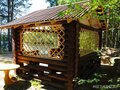Подвесной сибирский банный чан для парения на свежем воздухе, отделан деревом из алтайского кедра, к нему приставлена лесенка из того же ценного дерева. Чан из нержавейки с печью на водяной рубашке, что позволяет нагреть его снизу верх до температуры парения значительно быстрее.