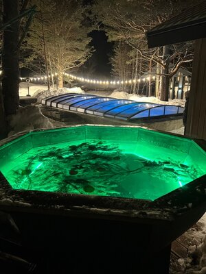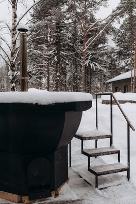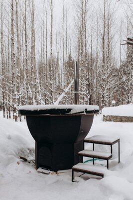 Банный чан с комфортом вмещает до 6 человек одновременно. Для придания аромата, в процессе растопки в чан погружаются еловые или иные ветки по