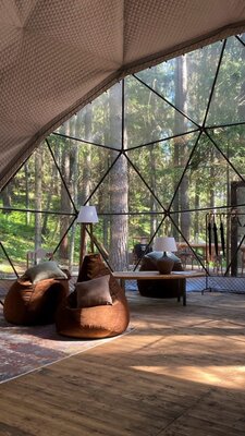 На веранде можно приятно провести время в шезлонгах, наслаждаясь общением и окружающей красотой. Главной частью глэмпинга является общая зона, где гости могут встречаться, играть в настольные игры, отдыхать и наслаждаться угощениями. Тут также расположен бар с кофе, чаем, вареньем и другими деликатесами, проектор для просмотра фильмов, детский уголок и доброжелательные взрослые, всегда готовые прийти на помощь.