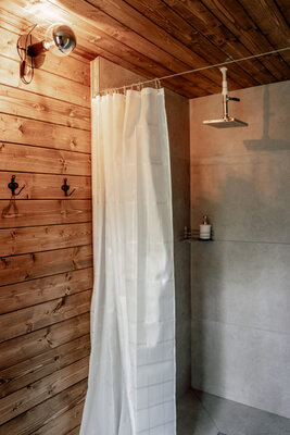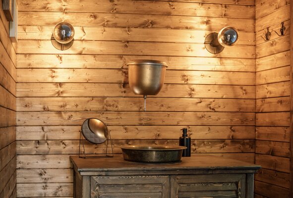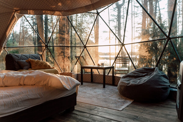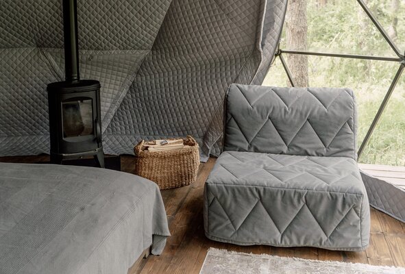 Каждый из 10 жилых модулей площадью 28 м² с потолком высотой 3,5 м предлагает уютные и просторные условия. Внутри модулей вы найдете широкую двуспальную кровать с белоснежным постельным бельем, биотуалет, умывальник, розетки, эффективную вентиляцию, чугунную печь и большое панорамное окно, открывающее великолепный вид на природу.
